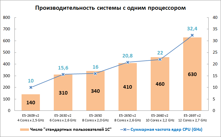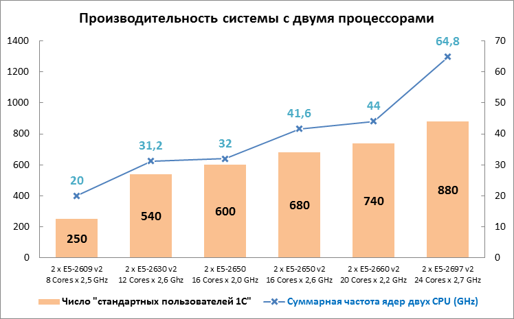 Какое максимальное количество "стандартных пользователей 1С" может "обслужить" двухпроцессорный сервер на базе Intel Xeon E5-2600?
