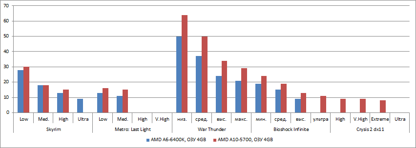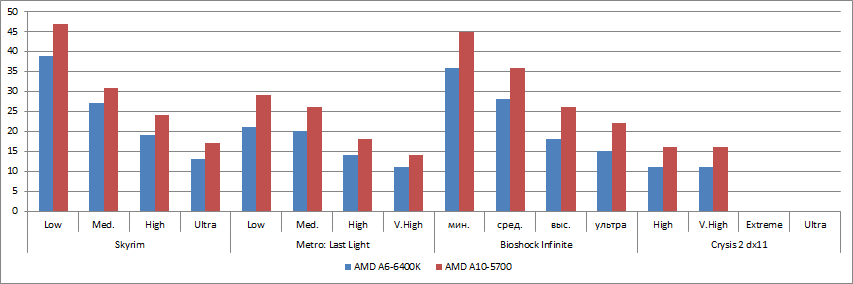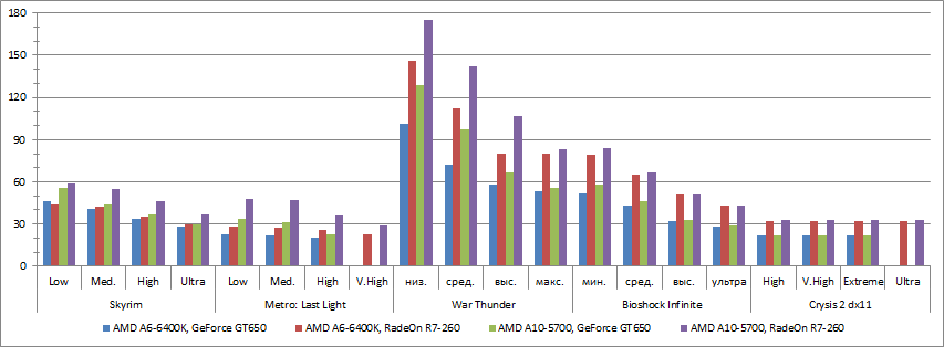 Как видим при снижении разрешения большинство игр достигает порога играбельности. Результаты авиасимулятора War Thunder для разрешения 720p не приводятся, т.к. они достаточно высокие и в разрешении Full HD. Сложный графический движок (CryEngine 3) игры Crysis 2 требует обязательного использования производительной дискретной видеокарты для нормальной работы.