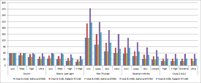 Как видим, в каждой из 5-и приводимых игр обеспечивается нормальный fps при использовании 3D-видеокарт среднего уровня (RadeOn R7-260 и GeForce GXT 760). Влияние процессора на производительность незначительно. Производительности GeForce GT 650 недостаточно лишь для игры в Crysis 2 (в разрешении Full HD).