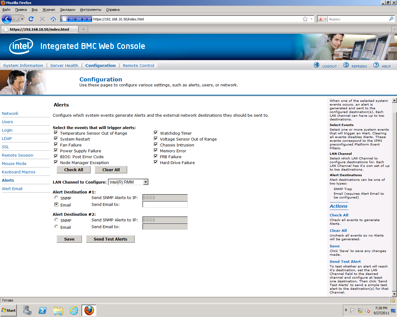 Alertsслужит для настройки оповещений по e-mail и SNMP.