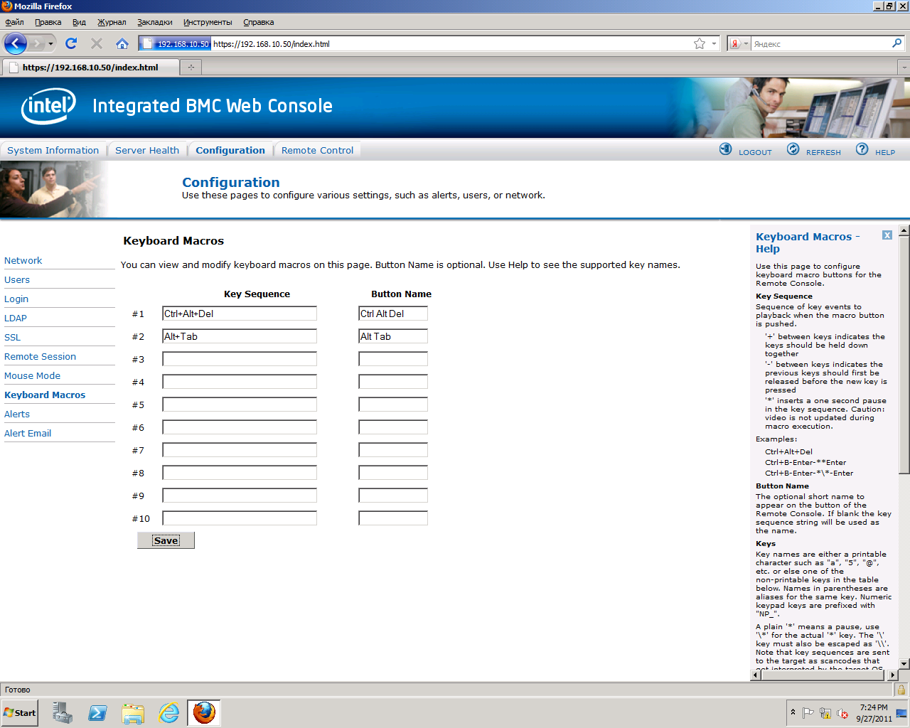 В правом верхнем углу окна консоли находятся кнопки клавиатурных макросов. Макросы удобно использовать в качестве замены комбинаций клавиш управления, поскольку нажатия этих клавиш не могут быть перенаправлены на сервер.