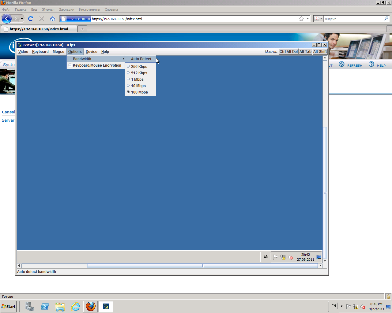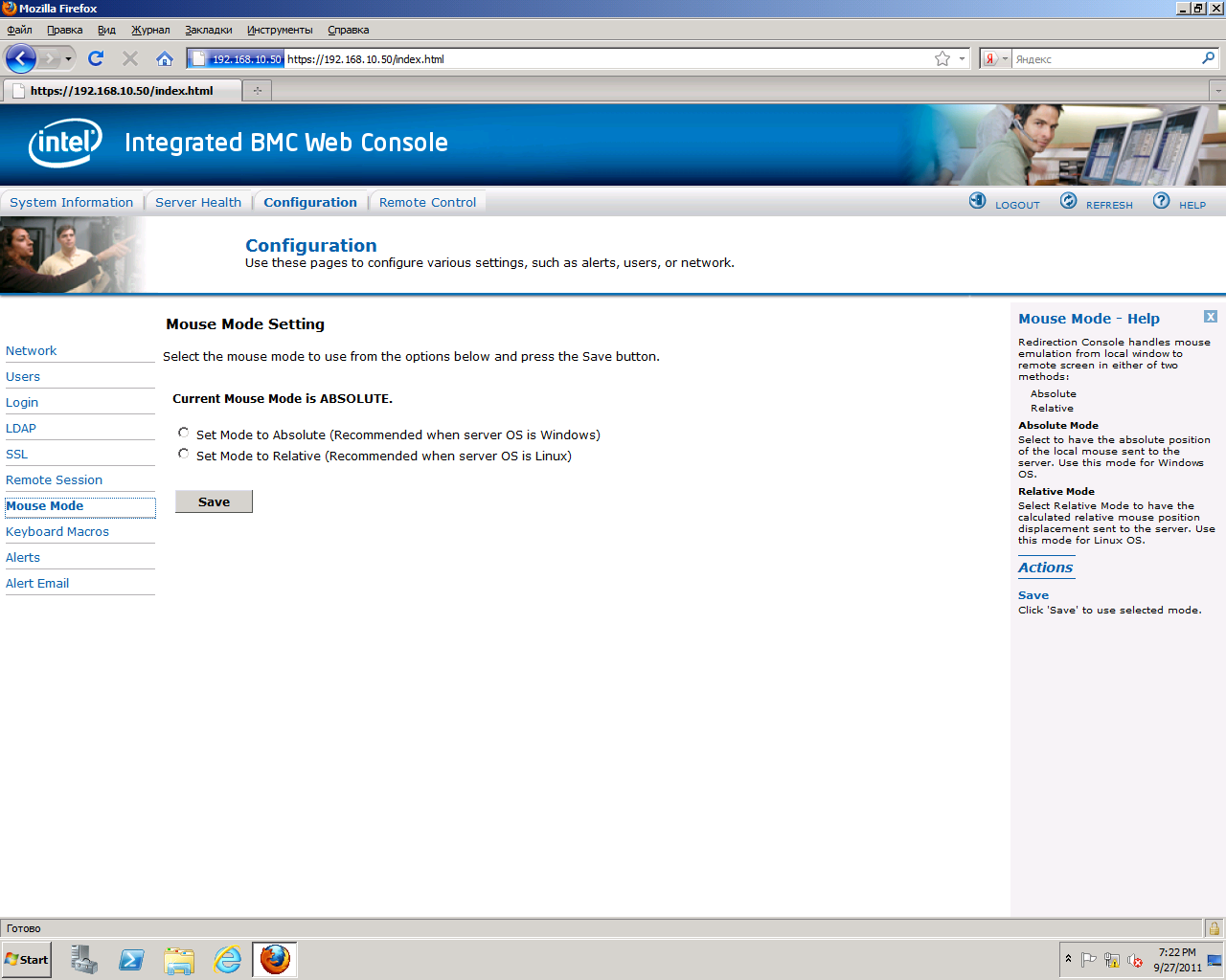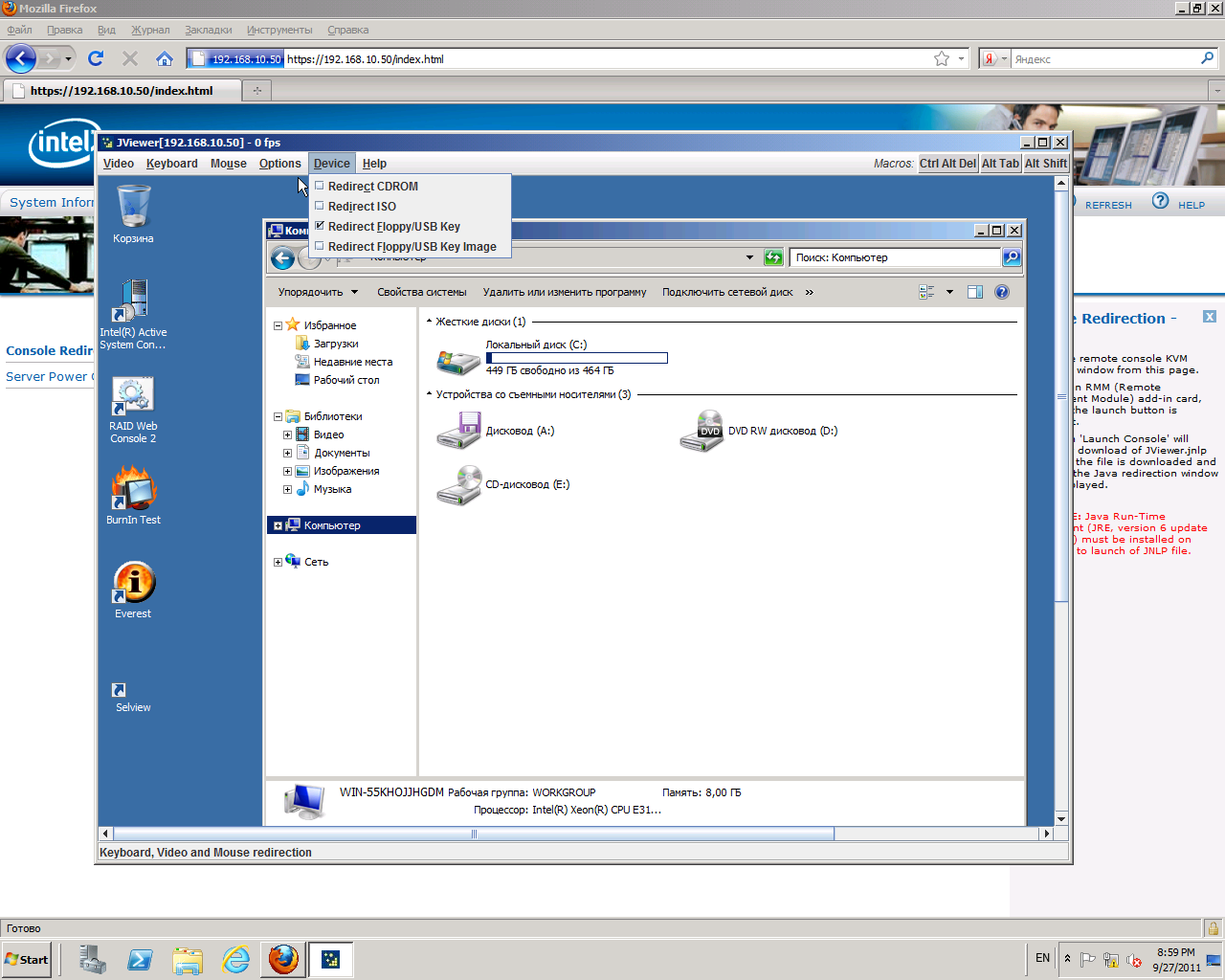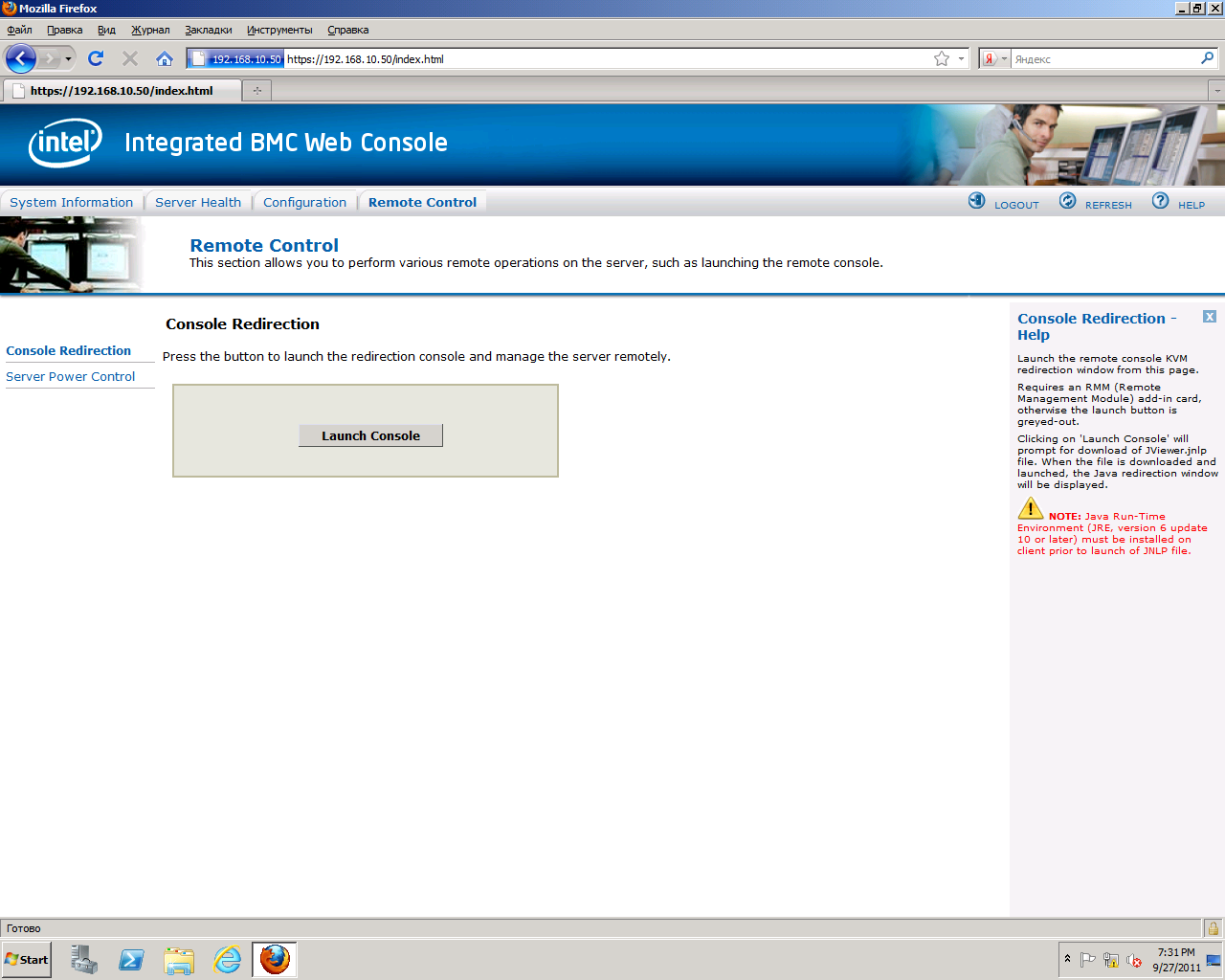 Console Redirectionпри помощи кнопки "Launch Console" запускает режим удаленной консоли сервера. При этом в новом окне отображается содержимое экрана сервера, а сигналы мыши и клавиатуры управляющего компьютера перенаправляются на сервер.