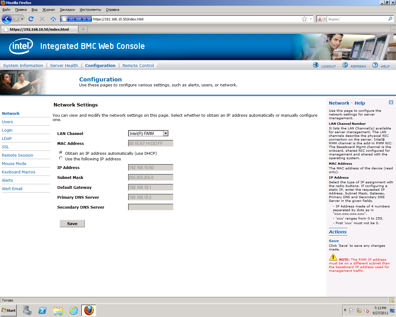 Networkпозволяет задать параметры сетевых портов RMM-модуля и BMC-контроллера.