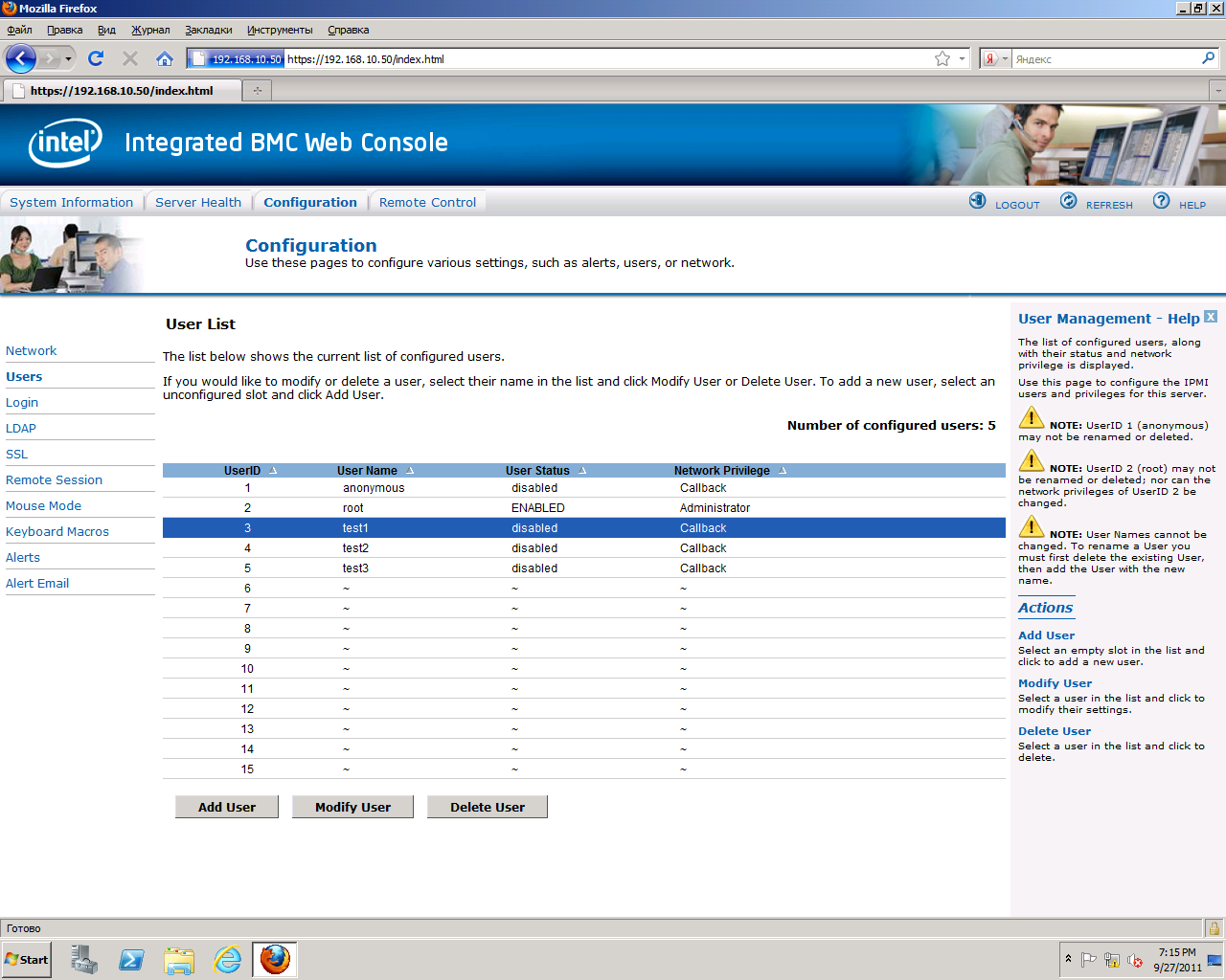 Чтобы активировать учетную запись пользователя, от лица которого будет осуществляться подключение к серверу через RMM-модуль, в настройках BIOS в этом же подразделе "BMC LAN Configuration" выберите любого пользователя (кроме "anonymous"), назначьте для него права администратора, активируйте этого пользователя и задайте для него пароль. Теперь можно выйти из BIOS SETUP, сохранив изменения. Настройка RMM-модуля завершена.
