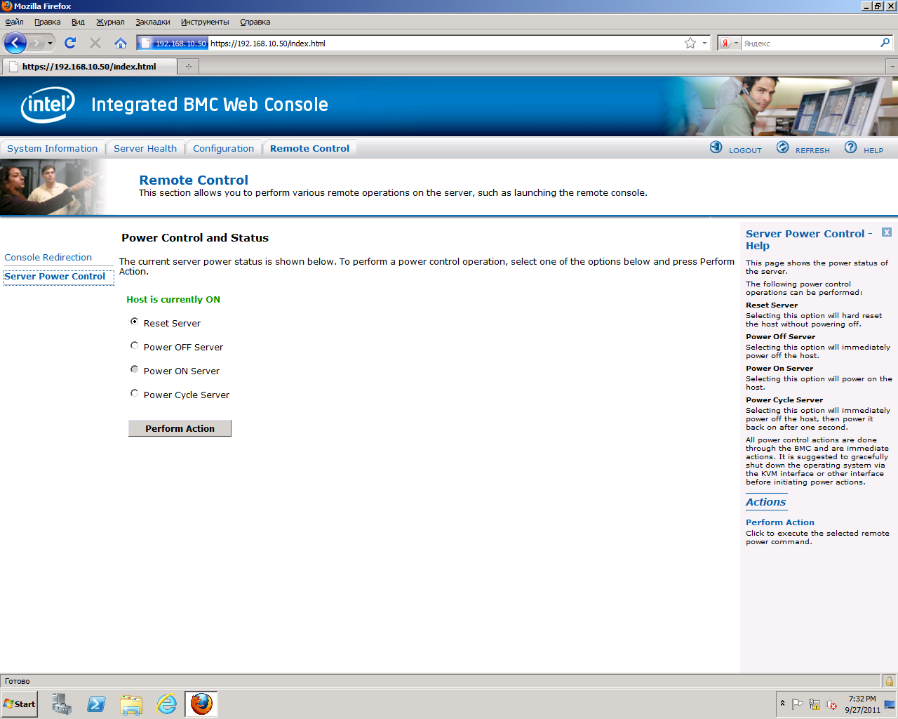 Вкладка "Remote Control" предназначена для запуска режима перенаправления консоли и управления режимом питания сервера: