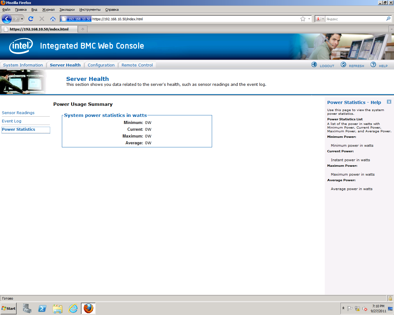 Power Statisticsвыдает статистику потребляемой мощности: минимальное потребление, текущее потребление, максимальное потребление, среднее потребление. Эта возможность доступна только на серверах, которые имеют управляемые блоки питания.