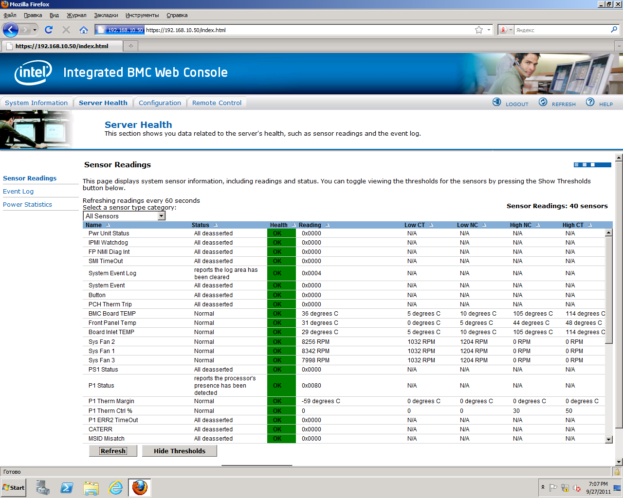 Sensor Readingsвыводит текущие показания аппаратных датчиков сервера. При помощи кнопки "Refresh" можно обновить данные, а кнопка "Hide Thresholds" позволяет скрыть пороговые значения параметров ("NC" - пороговое значение "Предупреждение", "CT" - пороговое значение "Критическое").