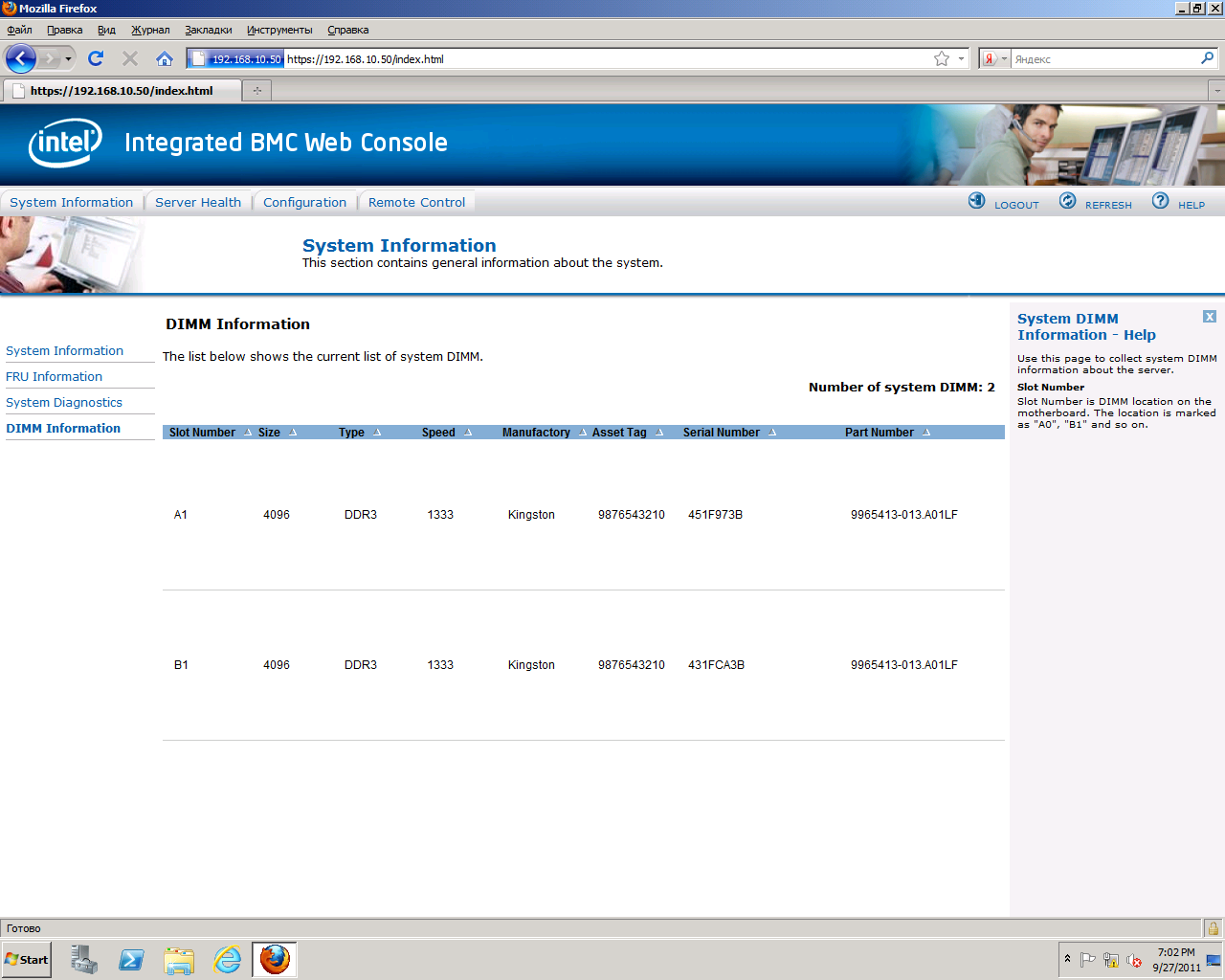 DIMM Informationвыдает таблицу, содержащую информацию об установленных на сервере модулях оперативной памяти.