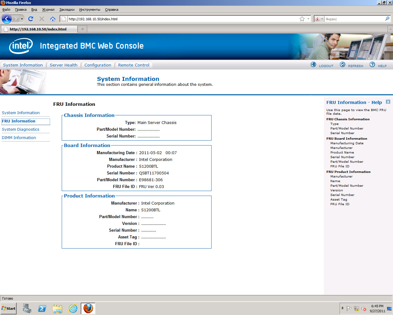 FRU Informationвыдает информацию, записанную в ячейках FRU (Field Replaceable Unit), для системной платы, корпуса, платформы и т.д.
