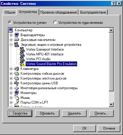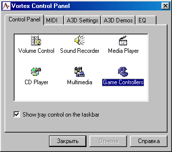 Выберите "Game Controllers" и в нем закладку "Дополнительно". В поле "Драйвер порта" выберите "Vortex Gameport Interface".