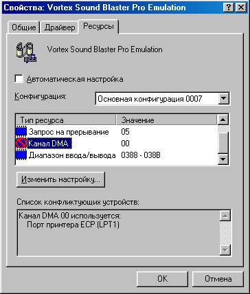 Для этого во вкладке "Ресурсы" уберите галочку "Автоматическая настройка", в поле "Конфигурация" выберите "Основная конфигурация 0007" (эта конфигурация позволяет использовать максимально широкий диапазон настроек). Затем нажмите "Изменить настройку" и задайте номер свободного канала DMA, который не используется другими устройствами. Скорее всего, это будет DMA1.