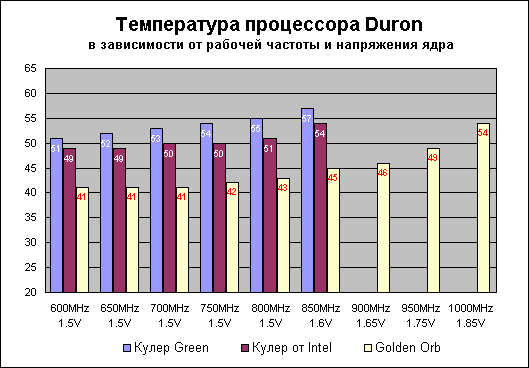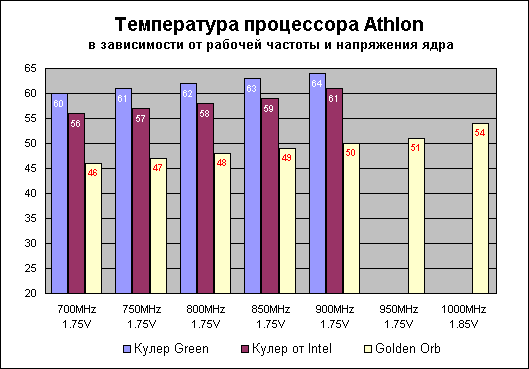 На штатных частотах (600, 650, 700MHz) для процессора Duron можно использовать любой из рассмотренных кулеров, при этом температура находится в допустимых пределах с хорошим запасом. Для процессора Athlon весьма желательно использовать кулер Golden Orb, поскольку с другими кулерами температура процессора слишком высока (хотя никаких зависаний и других проявлений нестабильности замечено не было). В любом случае применение кулера Golden Orb предпочтительнее, поскольку создает наиболее комфортные условия для работы процессора. Что касается разгона, то здесь все очевидно - у Golden Orb просто нет конкурентов.