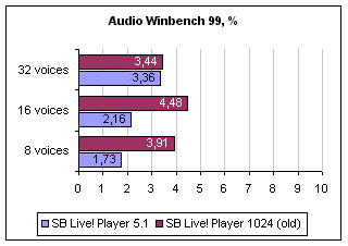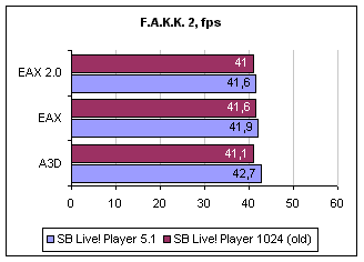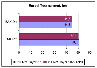 Посмотрим, как обстоят дела с ускорением звуковых 3D API во всеми любимых играх, но прежде в синтетическом Audio Winbench 99 от ZD Labs. Данный тест показывает степень загрузки процессора при выводе DirectSound3D потоков. Очевидно, чем меньше число, тем лучше. В Player 5.1 применена более новая ревизия чипа EMU10K1, и в Audio Winbench 99 новая карта показала более лучшие результаты, чем предшественница. Однако, в реальных играх ситуация полностью сравнялась, и Player 5.1 показал те же результаты (fps - кадры в секунду). Впрочем, как можно видеть по цифрам в Unreal Tournament, плата за игру с EAX совсем небольшая, не более 12%. Согласитесь, вполне приемлемая цена за реализм, не говоря уже о том, что в высоких разрешениях это падение сильно нивелируется видеокартой. Что, конечно, не является недостатком, а скорее особенностью ;-).