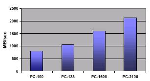 Исходя из этого пропускная способность памяти PC100: 800Мб/сек, а PC133: 1064 Мб/сек. Справедливости ради стоит отметить, что быстродействие подсистемы памяти определяется не только пропускной способностью, но и некоторыми другими факторами, например латентностью (таймингами циклов чтения/записи). Но все же роль bandwidth определяющая. За примером далеко ходить не надо - многие современные видеокарты на чипе GeForce 256 уже выпускаются в 2-х вариантах: с памятью SDR SDRAM и DDR SDRAM (GeForce2 GTS только с DDR SDRAM/SGRAM), преимущество последних особенно в высоких разрешениях и глубине цвета очень существенно. При этом, когда говорят например о частоте DDR памяти 166Мгц, подразумевают эффективную частоту в 333 Мгц. Кстати, подобные высокопроизводительные видеокарты есть у нас в продаже.