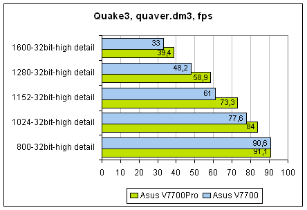 Теперь самое сладкое – тест, который должен заставить V7700Pro расправить плечи и вдохнуть полной грудью. Речь идет о Q3-демке под названием Quaver, широко известной в узких кругах. Записывалась она на уровне Q3DM9, очень насыщенном текстурами, суммарный размер которых превышает 30Mb. Все графические параметры мы установили на максимум (включая детализацию текстур), звук отключили. Использовался Quake3:Arena версии 1.17. Итак, начиная с разрешения 1024х768-32bit, V7700Pro лидирует, обеспечивая прирост скорости до 17%…