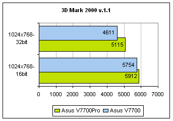 По причине отсутствия правильного и полноценного Direct3D-теста (в принципе), пришлось воспользоваться тестовым пакетом 3DMark 2000 v.1.1. Он также показывает лидерство V7700Pro, хотя и не очень большое…