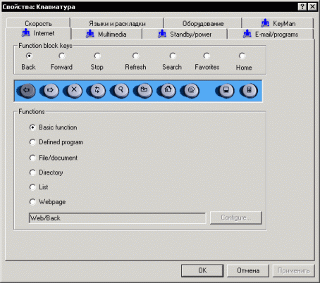 Увеличенное изображение дополнительных клавиш вы можете видеть на вкладках KeyMan. Обозначения вполне интуитивны и говорят сами за себя. Есть даже клавиши быстрого открытия My Computer и запуска калькулятора. Если по каким-то причинам вас не устраивает назначение этих клавиш по умолчанию, вы можете назначить на них свои собственные действия, например, запуск каких-либо программ и пр.