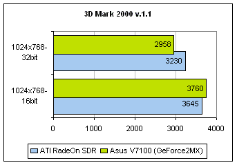 Подводя итоги, можно сказать, что ATI RadeOn SDR демонстрирует высокий уровень быстродействия, вполне сравнимый с видеокартами на базе чипа GeForce2 MX, превосходя последних в высоких разрешениях и глубине цвета. При этом RadeOn обладает более производительным блоком T&L, что может дать дополнительные преимущества в будущих играх с большим кол-вом полигонов и источников света.