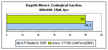 И, напоследок, технологическая демка Dagoth Moor Zoological Garden, активно использующая аппаратный T&L. Данная программа предназначалась для демонстрации возможностей видеокарт на базе GeForce. В этом тесте ATI RadeOn по скорости обошел Asus V7100, однако картинка отображалась не совсем верно. Так, небо было выкрашено в совершенно фантастические цвета. Скорее всего, эта проблема разрешится выпуском нового драйвера для RadeOn...