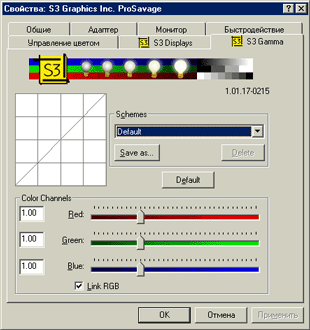 Несмотря на то, что графическое ядро ProSavage поддерживает большое количество 3D функций, никаких настроек и опций по 3D во вкладках видео мы не нашли. Обнаружились лишь два апплета: один относится к настройке цветовой гаммы, второй к отсуствующему ТВ выходу.
