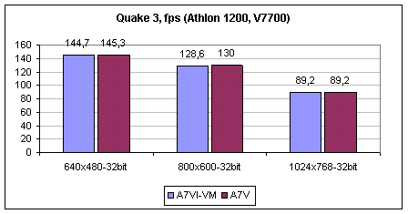 Следующий вопрос, что нас заинтересовал: как ведет себя плата при установке на нее мощного процессора и видеокарты (Athlon 1200, Asus V7700 - GeForce 2GTS)? Для ответа на него мы воспользвались типичным приложением для домашнего компьютера: жадным до скорости 3D-шутером Quake3. Здесь мы наблюдаем паритет между A7VI-VM и A7V. Обе платы показывают очень высокую скорость...