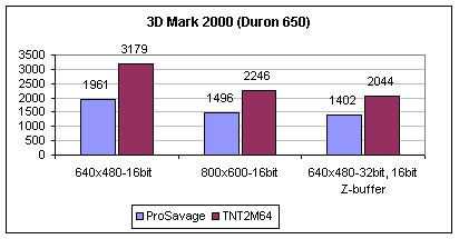 Мы решили сравнить производительность ProSavage с видеокартой на базе чипа TNT2M64 (Asus V3800Magic), близкого по скорости к Savage4. Само это сравнение на той же плате возможно благодаря тому, что на A7VI-VM предусмотрен разъем AGP 4x - не такой уж частый гость на платах с интегрированным видео.