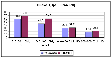 А вот в OpenGL картина совершенно иная. Скорость ProSavage в Quake3 вполне позволяет поиграть в эту игру в низких разрешениях и здесь отстававание от TNT2M64 совсем небольшое.