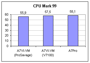 Теперь рассмотрим быстродействие A7VI-VM в сравнении с платой на чипсете VIA KT133, на основе которого и создавался KM133. Начнем с производительности системы в тесте целочисленного быстродействия CPU Mark 99 в сравнении с платой предшественницей A7V. Как видим, в случае использования интегрированных видеовозможностей платы, она демонстрирует более низкие результаты, чем в случае использвания отдельного видеоускорителя. Причина заключается в необходимости обслуживания видеобуфера в основной памяти, на что тратится больше системных ресурсов.