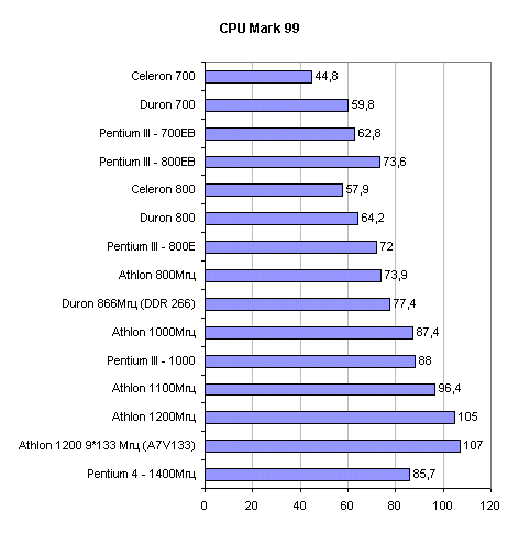 CPU Mark 99 - Этот тест показывает производительность процессора на целочисленных операциях. Большое значение на результаты этого теста оказывают: быстродействие подсистемы памяти, объем и организация кэша, частота системной шины. Таким образом результаты CPU Mark 32 хорошо коррелируются c большинством реальных приложений.
