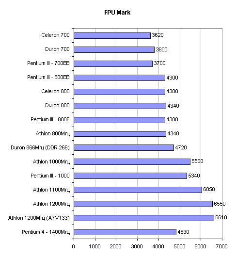 FPU Mark - Тест демонстрирующий быстродействие процессора при операциях с плавающей запятой. Слабо зависит от объема кэша и частоты системной шины.