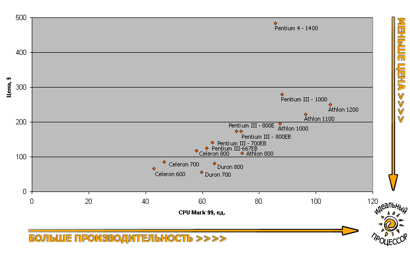 На приводимом чуть ниже точечном графике представлено соотношение производительности и цены для процессоров Intel и AMD. Найдя интересующий вас процессор на графике, вы можете представить насколько он соотвестсвует идеальному процессору: который ничего не стоит и при этом является самым быстрым ;). В качестве мерила быстродействия мы избрали CPU Mark 99 (подтест Winbench 99 v1.1.). Этот тест показывает производительность процессора на целочисленных операциях. Результаты CPU Mark 32 являются справедливыми в большинстве реальных приложений.