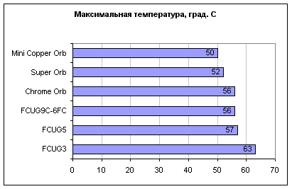 Как можно видеть на диаграмме, Mini Copper Orb оказался абсолютным рекордсменом по эффективности, при его использовании температура не превысила 50 градусов. Super Orb ревя почти как пылесос смог занять лишь почетное второе место. Chrome Orb и FCUG9C-6FC оказались в одной весовой категории, при этом первый заметно дешевле, а второго просто неслышно. Что касается FCUG5 то и он проявил себя довольно неплохо. А вот FCUG3 стал аутсайдером.