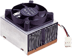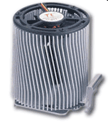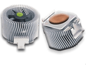 Теперь о модели гораздо более интересной, новинке от Elan Vital - FCUG9С-6FC. Это кулер с переменной скоростью вращения. Измеряя текущую температуру процессора, FCUG9С-6FC в реальном времени варьирует скорость вращения своего вентилятора. Таким образом, когда нет интенсивных вычислений, прогревающих процессор как печку, кулер почти не слышно. Свою технологию бесшумных кулеров Elan Vital назвала WHISPER (шептун). Что касается дизайна, то он в основном повторяет FCUG5, за исключением наличия чипа-регулятора скорости вращения на одной из граней. Кулер увесистый (265г) и очень эффективный. По данным Elan Vital может использоваться с Athlon-ами частотой до 1.5Ггц...