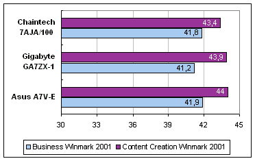 Business Winstone 2001 - данный тест измеряет общее быстродействие системы при работе с реальными офисными приложениями (преимущественно из состава Microsoft Office 2000), для чего загружается код приложений, в которых и проводится определенная работа по написанному заранее сценарию (script). Большее значение означает лучший результат.