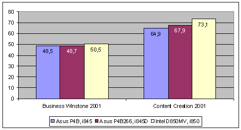 Результаты BW и CC 2001 настолько правильные и предсказуемые, что на основе этой диаграммы просто можно делать плакаты и отправлять в начальную школу: в Business Winstone, где приложения абсолютно нежадны до пропускной способности памяти, все три связки память-чипсет дали нам очень близкие результаты. Стало быть, обычным офисным приложениям, таким как Word и Excel, неважно какая там у нас память на P4 - "они никуда не спешат". А вот в Content Creation картина совершенно иная - платы распределились в порядке возрастания скорости подсистемы памяти чипсетов. P4B266 на 5% обошла свою SDRAM коллегу (P4B, i845) и на 7% отстала от решения на Rambus (D850MV, i850).