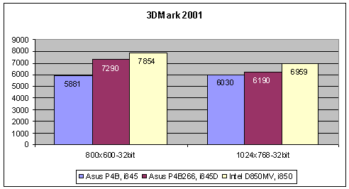 В 3D-приложении, коим является 3DMark 2001, наша соискательница также была на втором месте, причем в разрешении 800x600-32bit ее результаты гораздо больше походили на цифры платы с RDRAM, чем в 1024x768, где плата на i850 резко ушла вперед. Преимущество P4B266 над P4B составило от 10 до 20%, но в высоких разрешениях, где видеоускоритель начинает оказывать большее влияние на результаты, этот разрыв уменьшился.