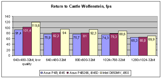 На диаграмме чуть выше есть несколько примечательных моментов: во-первых, обратите внимание на первые 3 столбика - они показывают пиковую скорость, когда все графические опции игры, кроме глубины цвета были снижены до минимума. Хорошо видно, сколько память дает в общую копилку скорости системы - и RDRAM тут просто на коне. Второй интересный момент - это результаты платы P4B в 3 основных разрешениях, здесь пропускная способность памяти PC-133 словно ножницами сверху подравняла fps-ы до одинаковых значений.