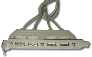 Для подключения USB устройств к плате прилагается очень симпатичный 4-х портовый разъем на заднюю панель корпуса, к которому можно подключать и обычные - USB 1.1 устройства, благодаря обратной совместимости интерфейсов.
