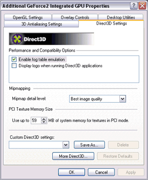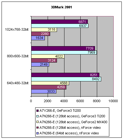 В 3DMark 2001 детище Asus и Nvidia показывает отличные результаты: при 128bit доступе к памяти встроенное видео показало хорошие результаты по сравнению с внешней видеокартой на базе GeForce2 MX400, хотя графический чип последней и работает на более высокой частоте (175 против 200Мгц). В низких разрешениях разрыв составлял всего около 6% и, конечно, отставание увеличивалось по мере роста разрешения. Однако справедливости ради стоит отметить, что едва ли стоит играть в современные игры на GeForce 2MX в разрешении большем, чем 800x600.