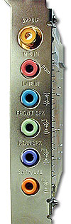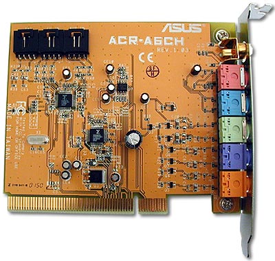 Компонентов на ACR-плате немного, оно и понятно - вся математика просчета звука реализована на материнской плате, а задача первой лишь вывести/завести сигналы, для чего на плате и находятся два качественных звуковых кодека Sigmatel (STAC9721T, STAC9708T). Разъемы же на плате есть следующие: выход на передние колонки, на задние колонки, на центральный канал и сабвуфер, линейный вход (и микрофон), коаксиальный цифровой S/PDIF.