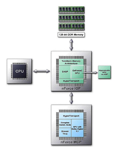Завоевав звание графического короля и продолжая позиционные бои с компанией ATI на рынке 3D-ускорителей, компания nVidia обратила свой взор на перспективнейший рынок системных чипсетов. Дебютным чипсетом стал nForce, в котором реализовано множество уникальных архитектурных решений, позволяющих детищу nVidia претендовать на звание быстрейшего (!) набора логики для платформы AMD.