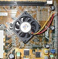 Дизайн платы A7N266-E хороший, вот только размещение процессорного гнезда на краю платы, да еще ближе к блоку питания показалось нам не самым лучшим решением - так, устанавливать на процессор некоторые модели кулеров, когда плата уже установлена в корпус неудобно. В остальном претензий не нашлось: разъемы IDE и ATX-power находятся на краю PCB, так что шнуры не потянутся через всю плату. Достать немногочисленные DIP-переключатели, что есть на плате, тоже легко, даже когда слоты PCI заполнены платами расширения. Доступ к разъемам DIMM также удобен. На плате также есть, так называемый Warning LED, который загорается, если пользователь попытается установить в AGP-слот устаревшую AGP-видеокарту на 3.3В. Как и большинство северных мостов современных плат, IGP чипсета nForce имеет качественное активное охлаждение, южный же мост греется незначительно и потому в нем не нуждается.