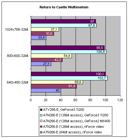 При установке отдельной производительной видеокарты на базе GeForce3 Ti200, nForce показал зубы: A7N266-E во всех разрешения обошла недавнего лидера A7V266-E! Преимущество составило около 3%, что хоть и немного, но все равно заставляет аплодировать Nvidia за создание столь производительного чипсета.
