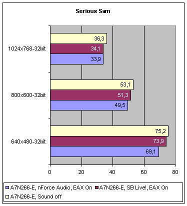 4) Serious Sam - современный OpenGL 3D-шутер и отличный бенчмарк. Тестирование в Serious Sam мы решили провести немного по-другому: так как эта игра поддерживает популярное расширение к DirectSound 3D - EAX, мы решили проверить качество реализации EAX на примере конкретной игры, заодно выяснив его производительность. Для сравнения мы решили использовать SB Live! как аналог по возможностям nForce Audio.