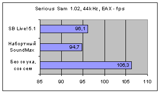 Давайте посмотрим на "прожорливость" звукового решения платы D845BG на примере современной 3D-игры - Serious Sam, которая поддерживает расширение к Direct Sound 3D - EAX. При помощи EAX передаются звуковые особенности окружения игрока, специфика помещения, эхо и реверберация конкретной игровой локации (пещера, лес, подводные глубины и прочее).