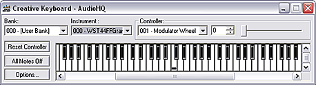 Наконец, вся подготовительная работа сделана - запускаем приложение Keyboard из AudioHQ и можно играть. Сменить текущий инструмент с пианино на любой другой, поддерживаемый текущим банком, можно во вкладке Instrument…