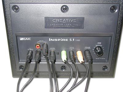 К Team Lion акустика подключается тремя кабелями, на выходы звуковой карты Audigy. Со стороны Inspire 5300 подключение выглядит несколько сложнее, но и это не страшно, так как есть цветовая маркировка кабелей и гнезд.