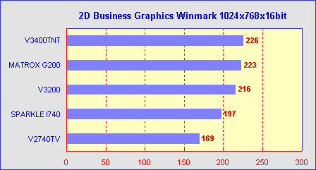 Скорость обработки плоской графики (2D-производительность). Все современные видеокарты имеют встроенный 2D-акселератор и, как следствие, обладают очень высокой 2D-производительностью, достаточной для большинства приложений. Обратить внимание на этот параметр Вам следует в том случае, если Вы собираетесь профессионально заниматься компьютерной графикой. Для оценки этого параметра мы будем пользоваться показателем Business Graphics Winmark 98. Этот показатель отражает быстродействие видеокарты на стандартных Windows-приложениях.