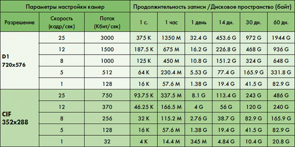 Расчёт объёма дискового пространства для видеоархива (на один канал в режиме непрерывной записи). Речь идет о каналах, а не камерах потому, что некоторые новые IP-видеокамеры позволяют записывать более одного канала, однако в большинстве случаев одна камера означает лишь один канал видеоданных: