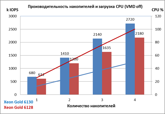 С процессорами Intel Xeon Gold 6128 производительность во всех случаях меньше на 10-25% и при четырех накопителях загрузка CPU составляет 100% (красная линия). Очевидно, мощности этих процессоров недостаточно для полной загрузки накопителей.